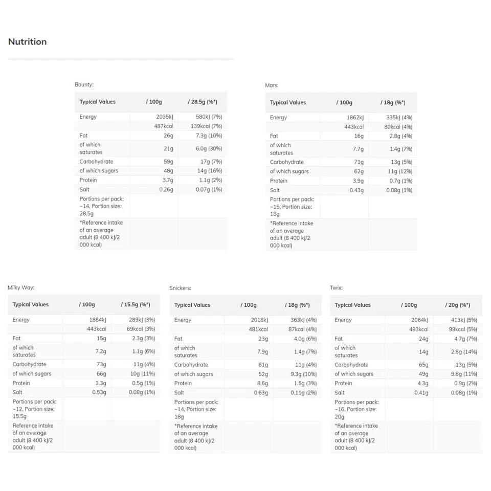 An assortment of our most popular chocolates, this multipack is full of snack bars in small fun sizes, ideal for treating yourself (and feeling like a giant when you hold one). This 1.4kg bulk chocolate bars bag contains 71 fun-size bars of Snickers, Mars, Bounty, Twix and MilkyWay. Popular for Birthday parties, and perfect Halloween chocolate, why not even add to your Christmas stockings or to your own advent calendar . These versatile snack bars are sure to delight, whether you’re sharing with friends or enjoying a festive indulgence!