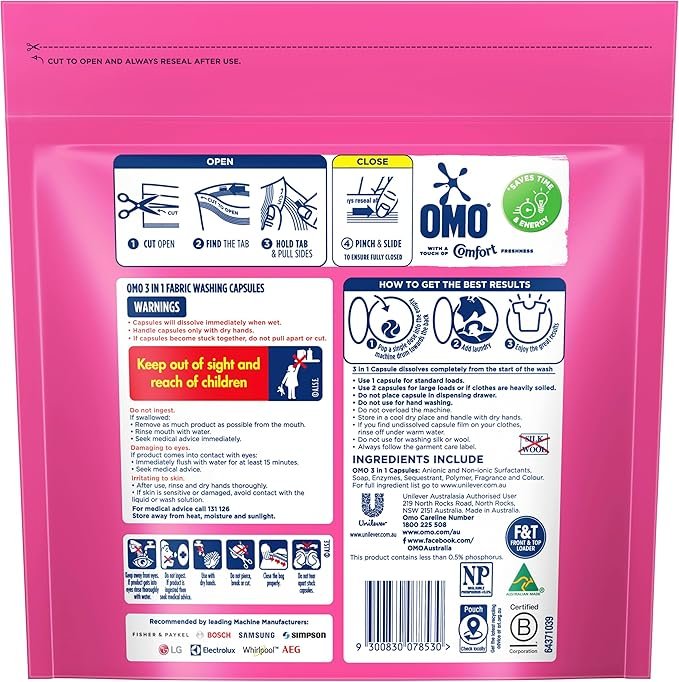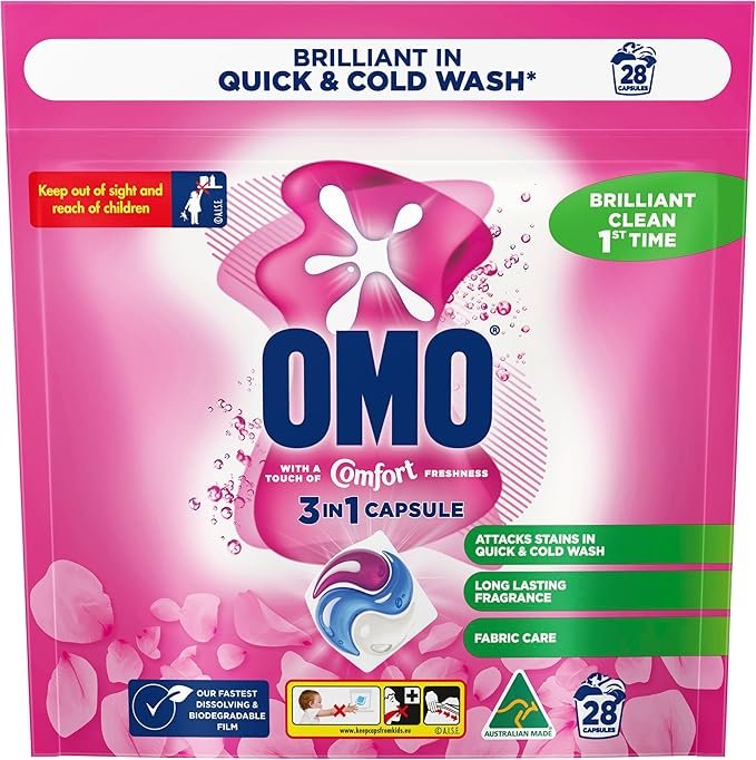 - OMO 3 in 1 Laundry Capsules with a touch of Comfort freshness provide a brilliant clean first time